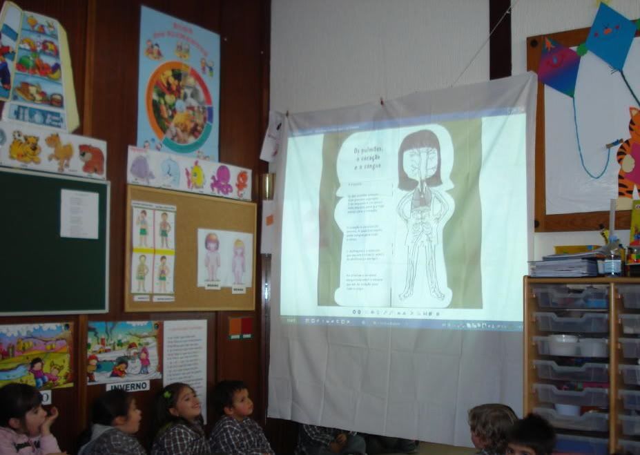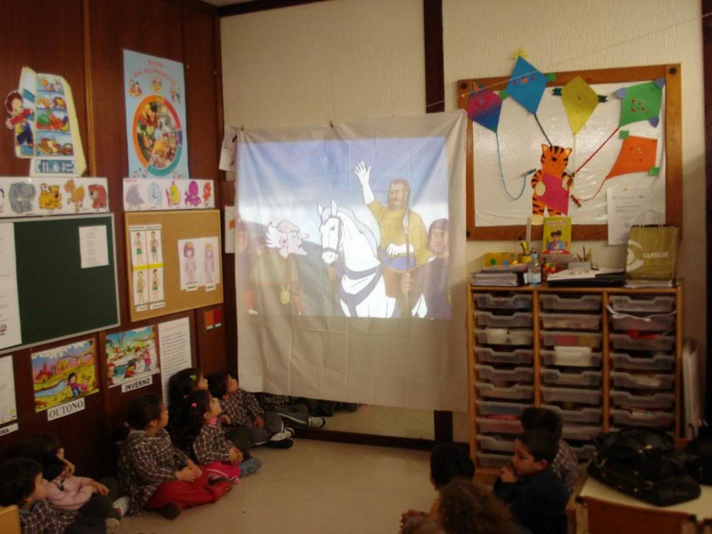 Pois, hoje à tarde pusemo-lo em prática.Como não temos computador na nossa sala para jogarmos, com a ajuda do datashow realizamos um jogo interactivo. Nós "davamos as ordens" e a nossa Educadora, com o dedinho, punha-as em prática.